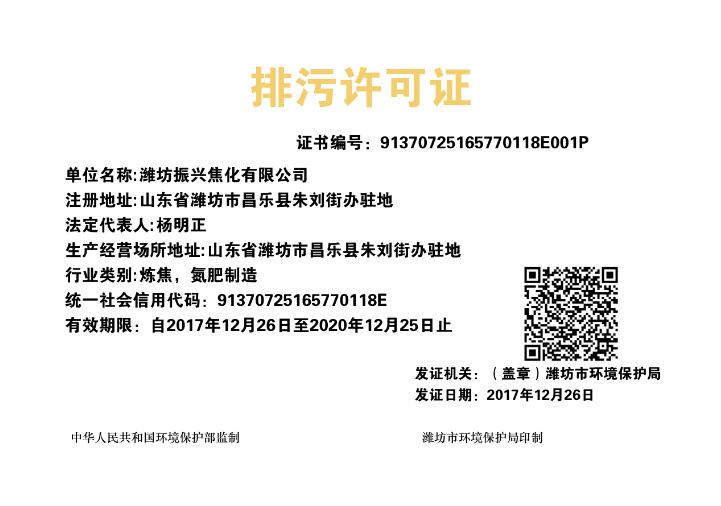 經(jīng)過近一個(gè)月的共同努力,振興焦化公司終于如期完成了環(huán)保排污許可證的辦理工作,12月26日,環(huán)保排污許可證順利發(fā)放,